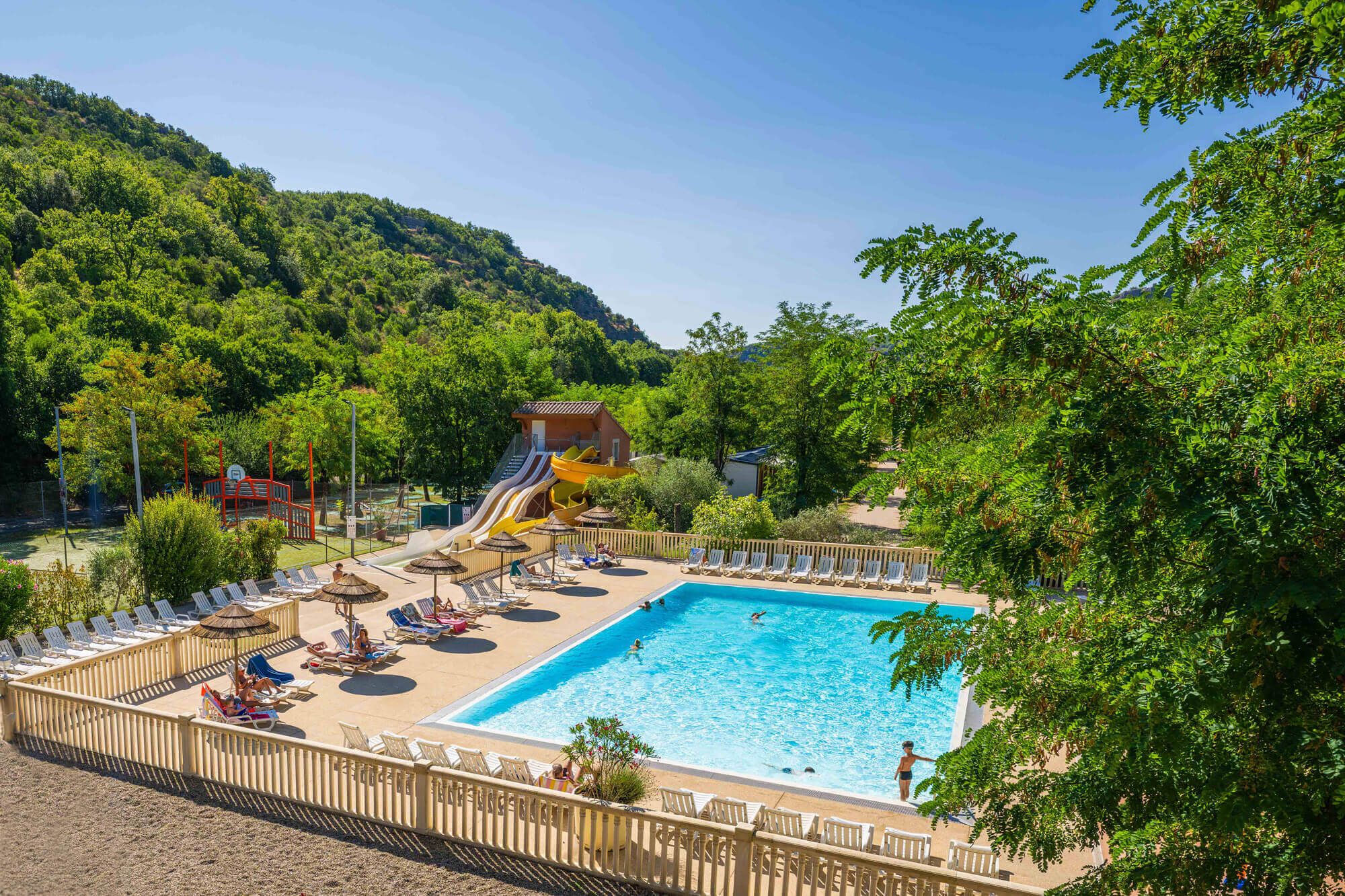 Notre camping avec parc aquatique Ardèche vous propose un espace aquatique composé de 4 toboggans, d’un grand bassin de nage et un espace jeux d’eau pour les plus petits.